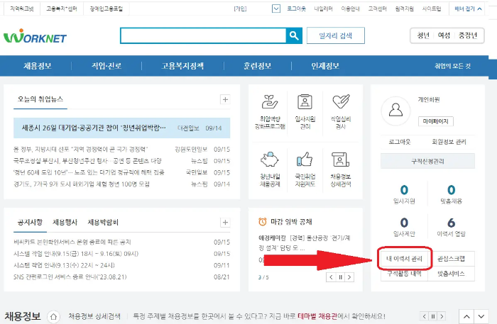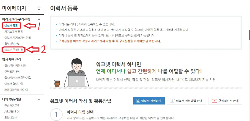 경로 : 워크넷 사이트 - 개인 로그인 - 내 이력서 관리 - 이력서 작성 및 등록 - 워크넷 구직신청