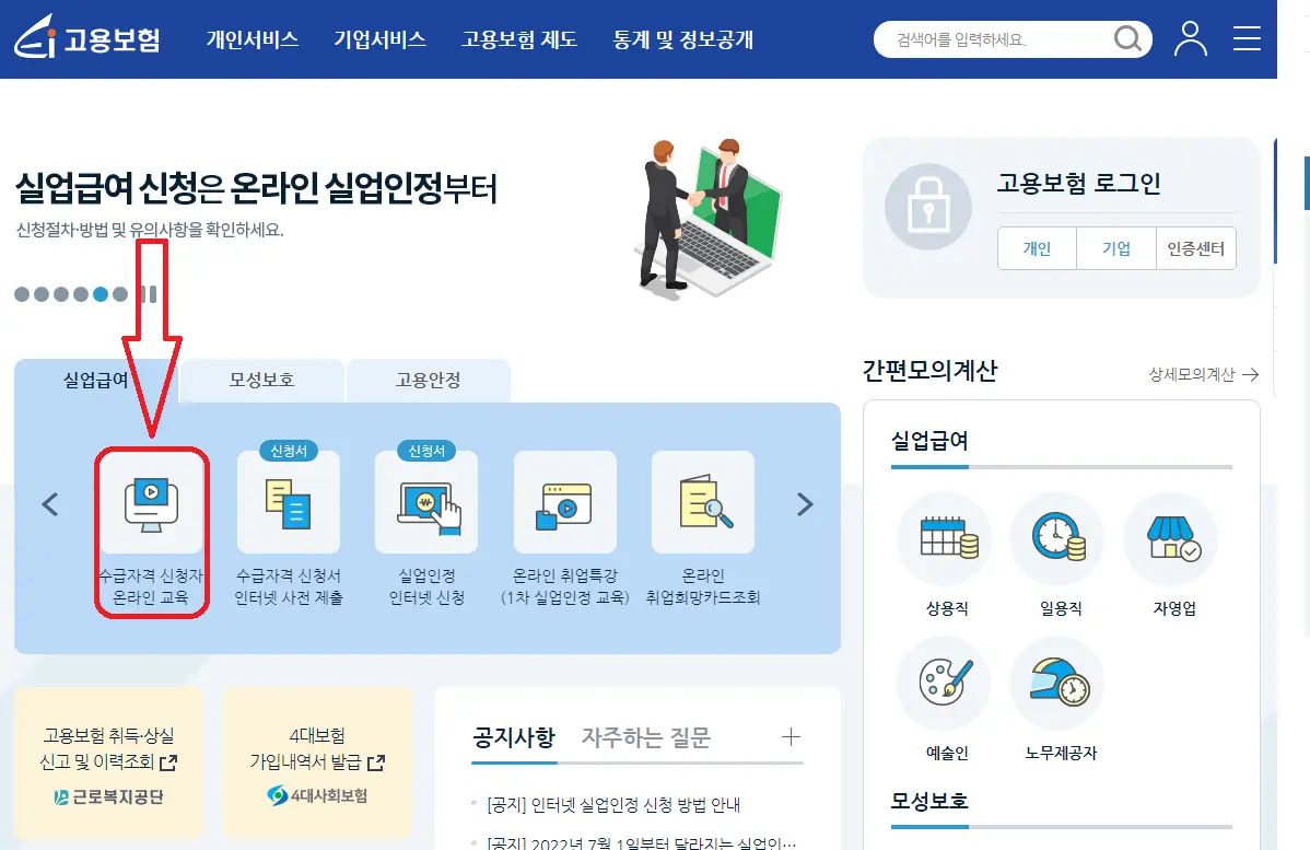 인터넷 발달로 요즘에는 모든지 집에서도 가능하게 된 게 참 편한 거 같습니다. 실업급여의 조건들을 알아본 뒤 집에서 편하게 온라인으로 신청해 보세요. 하지만 실업인정일 대면 출석이 필요하기 때문에 1차 교육과 4차 교육 때는 방문이 필요합니다.